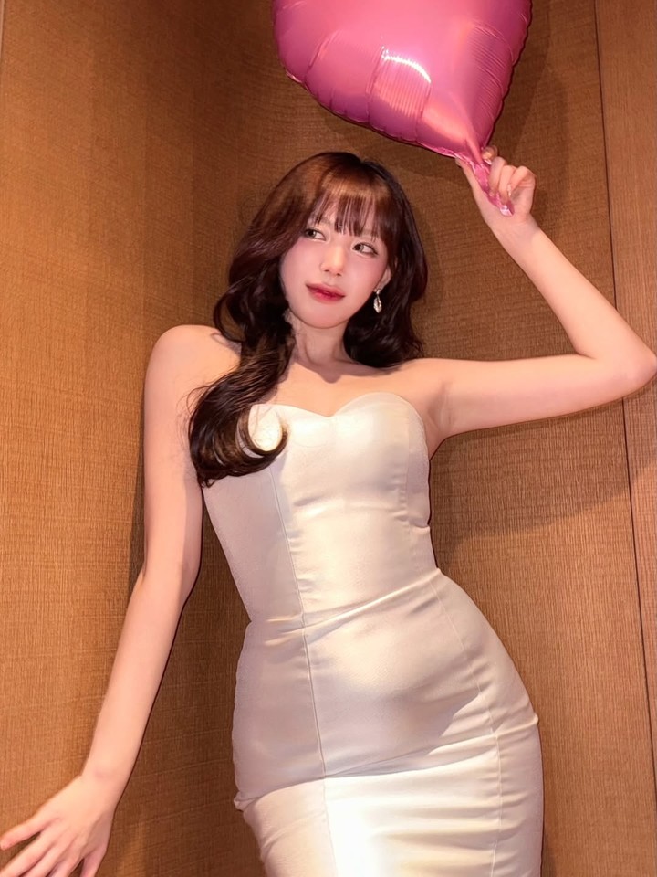 특히 옆선을 따라 자연스럽게 흐르는 실루엣은 우아함을 배가시키며, 드롭형 이어링과 웨이브 헤어스타일이 클래식한 분위기를 연출한다. 또 다른 컷에서는 분홍색 하트 풍선을 든 채 사랑스러운 표정을 지으며, 생동감 넘치는 순간을 공유했다.