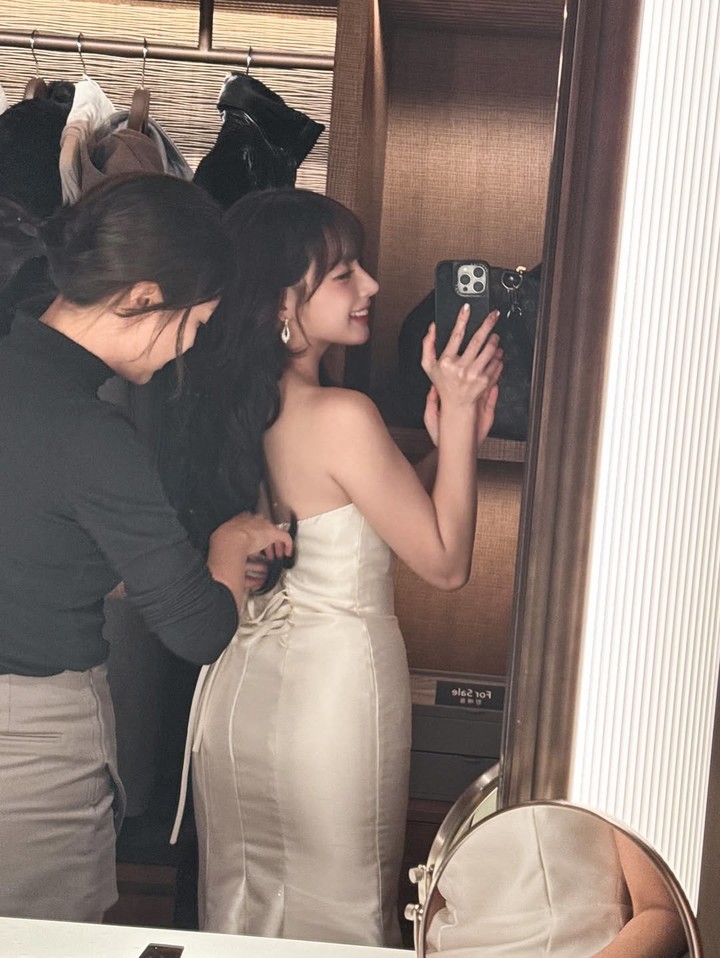 이어진 사진에서는 스타일리스트가 드레스 끈을 조여주는 장면도 담겼다. 하지원은 거울 앞에서 미소를 지으며 카메라를 응시하고 있고, 준비 과정마저도 화보 같은 비주얼로 팬들의 감탄을 자아냈다.