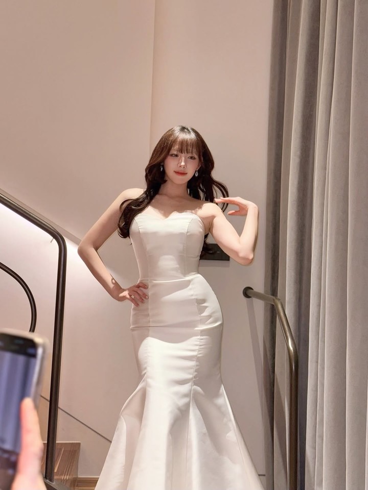 하지원은 최근 자신의 SNS를 통해 거울 셀카와 함께 촬영 비하인드가 담긴 다수의 사진을 공개했다. 공개된 사진 속 하지원은 몸에 밀착되는 실크 소재의 화이트 머메이드 드레스를 입고 포즈를 취하고 있다. 상체 라인을 강조한 코르셋 디테일과 백 리본 스트랩이 더해져 여성스러우면서도 고급스러운 무드를 완성했다.